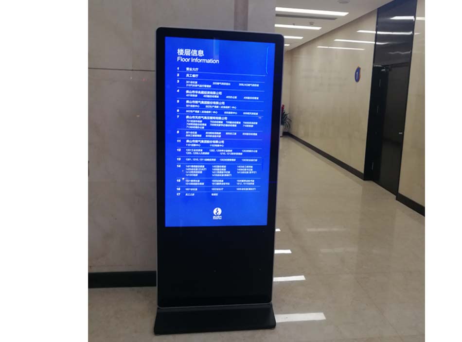 國有企業(yè)辦公大樓,電梯間安裝壁掛式廣告機,用于播放企業(yè)文化,企業(yè)資訊;通道處擺放立式廣告機,樓層信息指引。